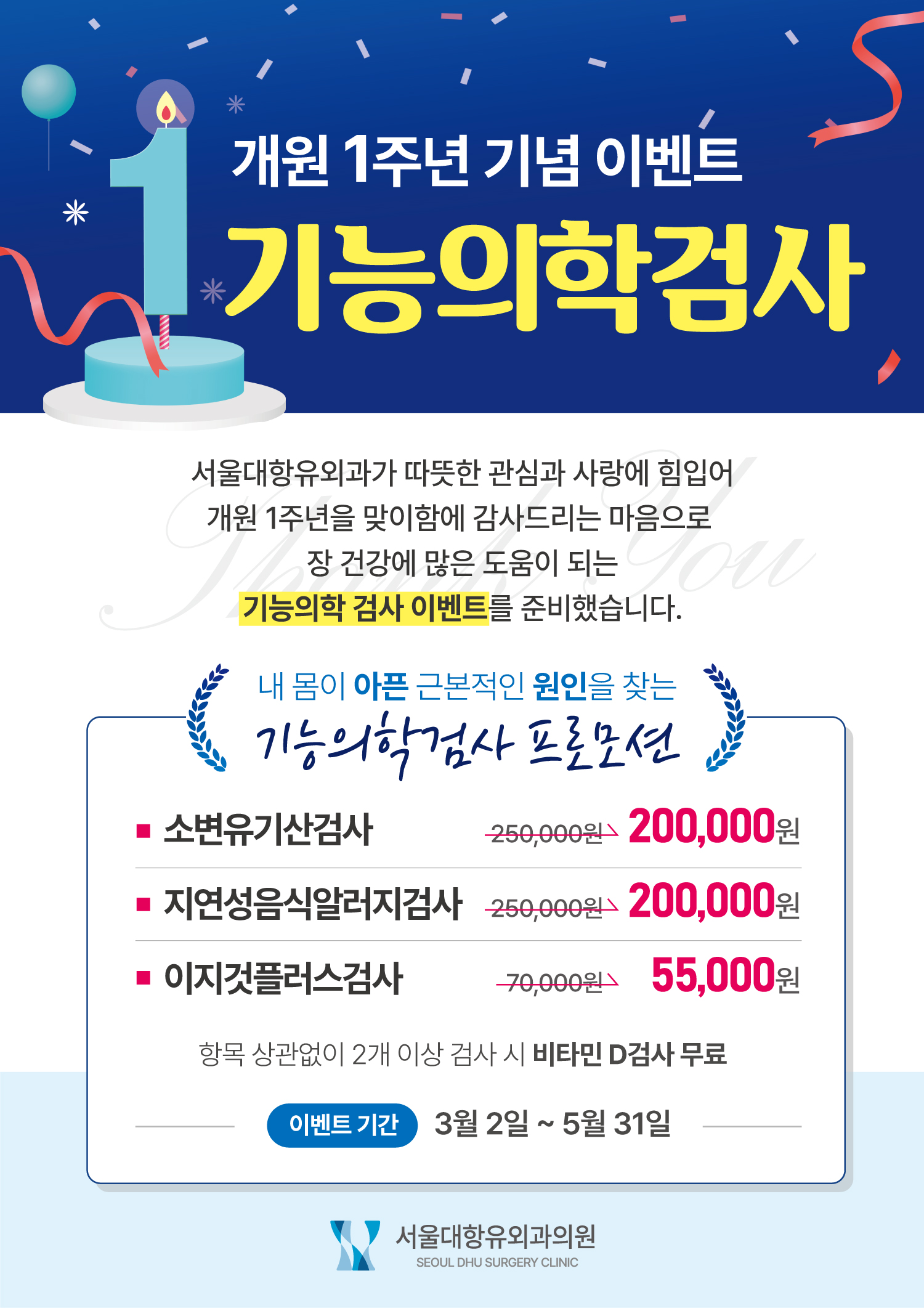 서울대항유외과가 따뜻한 관심과 사랑에 힘입어 개원 1주년을 맞이하였습니다. 이에 감사드리는 마음으로 장 건강에 많은 도움이 되는 기능의학검사 이벤트를 준비했습니다.