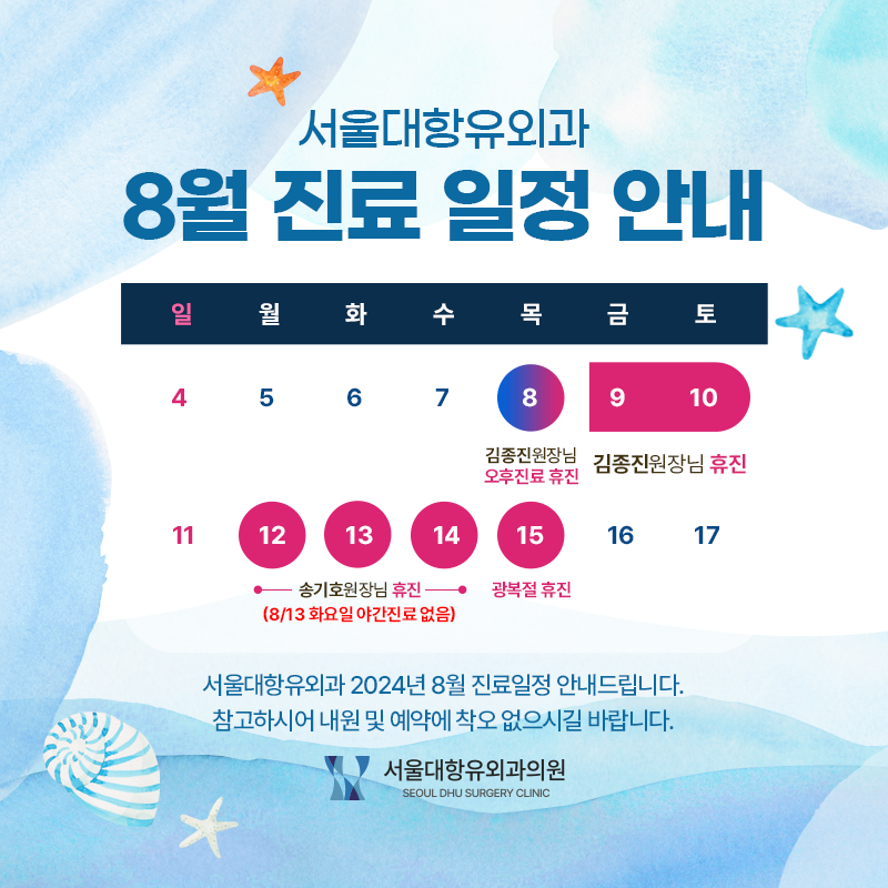 서울대항유외과 8월 진료 일정 안내